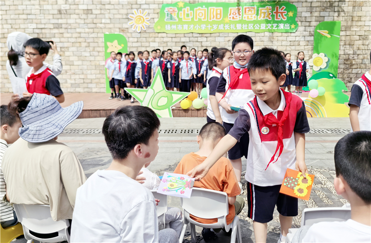 5月20日,江苏省扬州市育才小学三年级举办以“童心向阳·感恩成长”为主题的“10岁成长礼暨社区公益汇演”社会实践活动。三年级的10岁小学生通过集体庆生展才艺的方式,传递一份童真的温暖与爱心,表达自己的感恩之情。