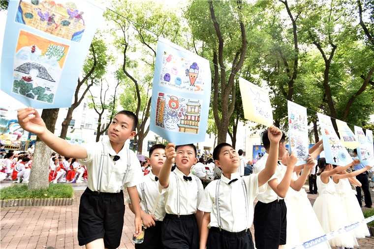 参加集体“10岁成长礼”的孩子们,向儿童福利院同龄小伙伴赠送自己的绘画作品。