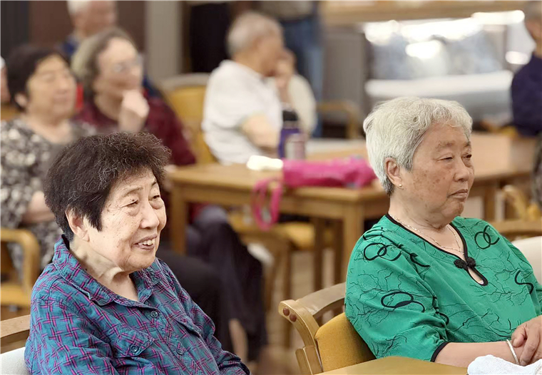 养老院里的老人们在开心观看孩子们的文艺演出。