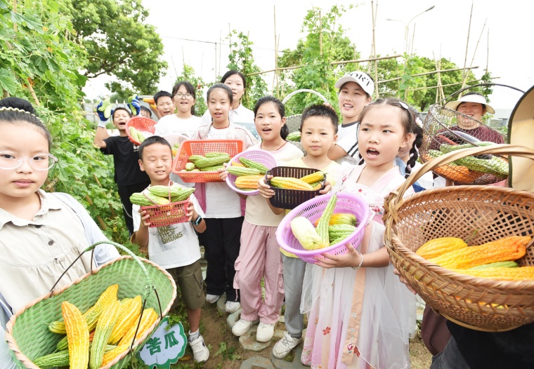连日来,江都区郭村镇周楼小学开展暑期“三色篱”特色劳动教育实践活动,采取“大手牵小手”——亲子共育的形式,通过聆听红色故事、体验劳动采摘、制作苦瓜美食等特色劳动实践内容,感悟革命先辈的保家卫国、艰苦奋斗精神,珍惜当下幸福生活。(扬州日报 庄文斌 摄)
