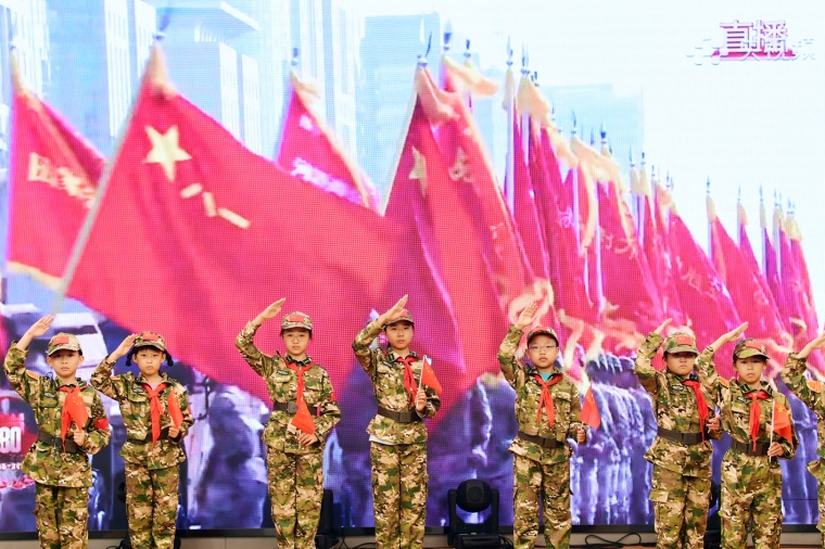 扬州市花园小学“国防小卫士社团”成员观看阅兵式,争当新时代好少年。庄文斌 韦文东 摄