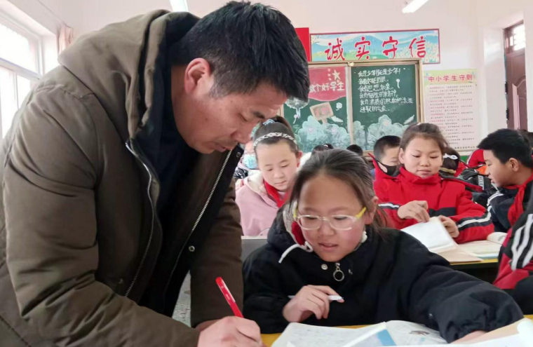 图为,孔军老师耐心给支教的孩子辅导作业。